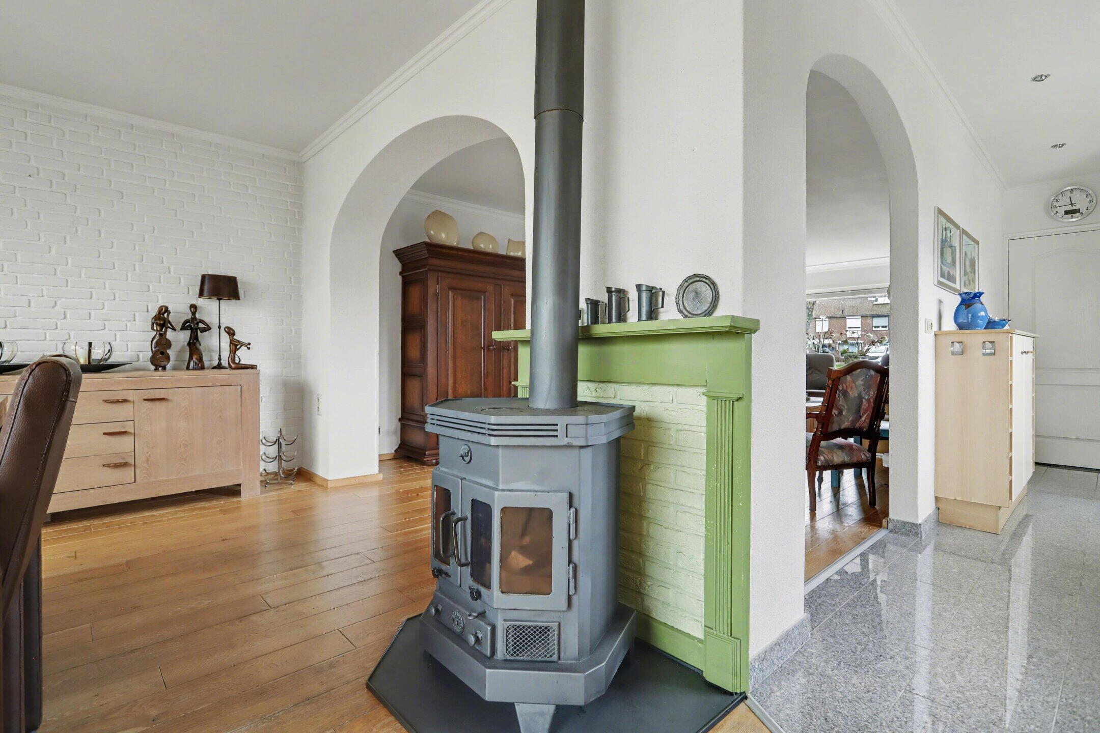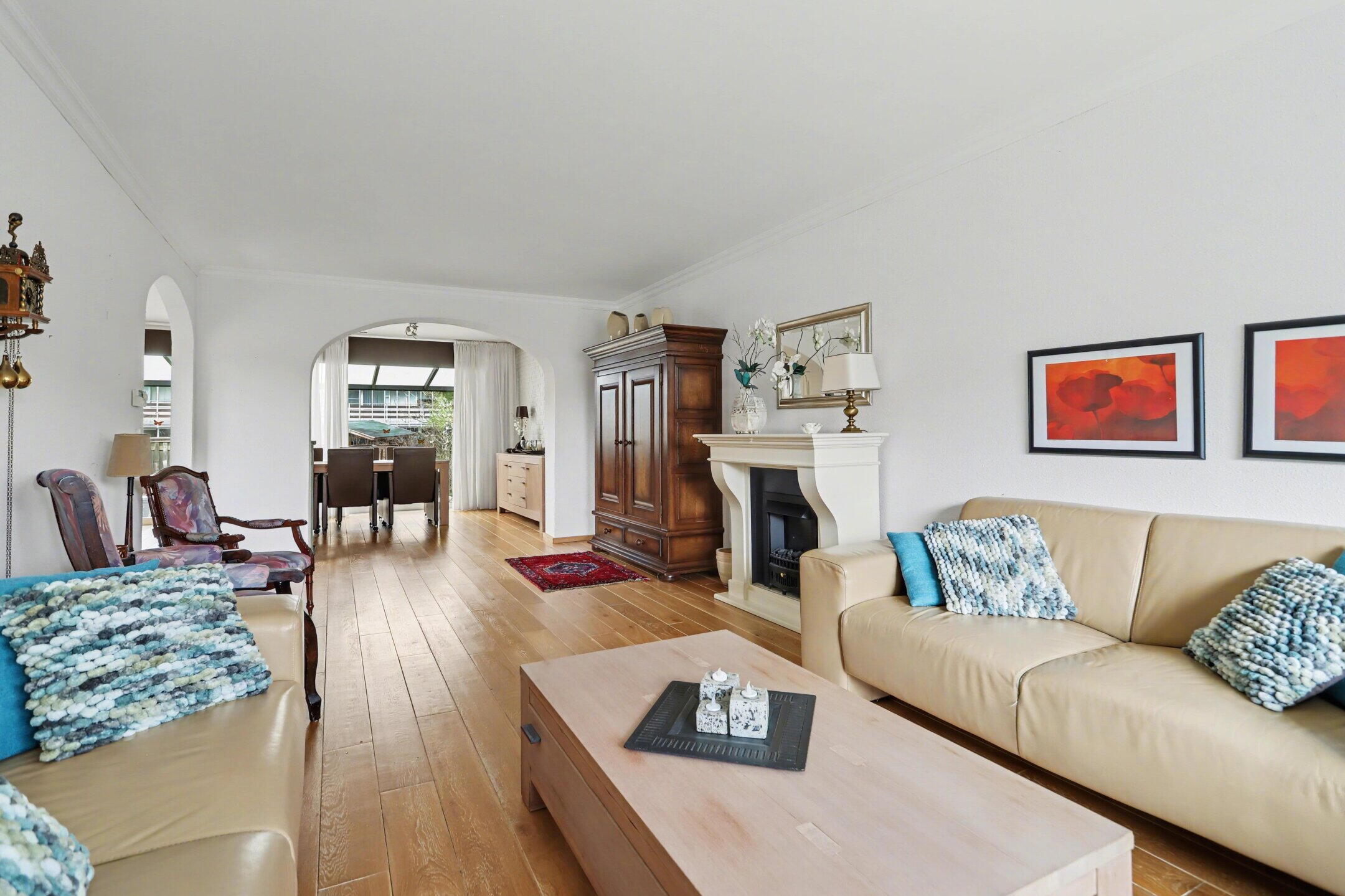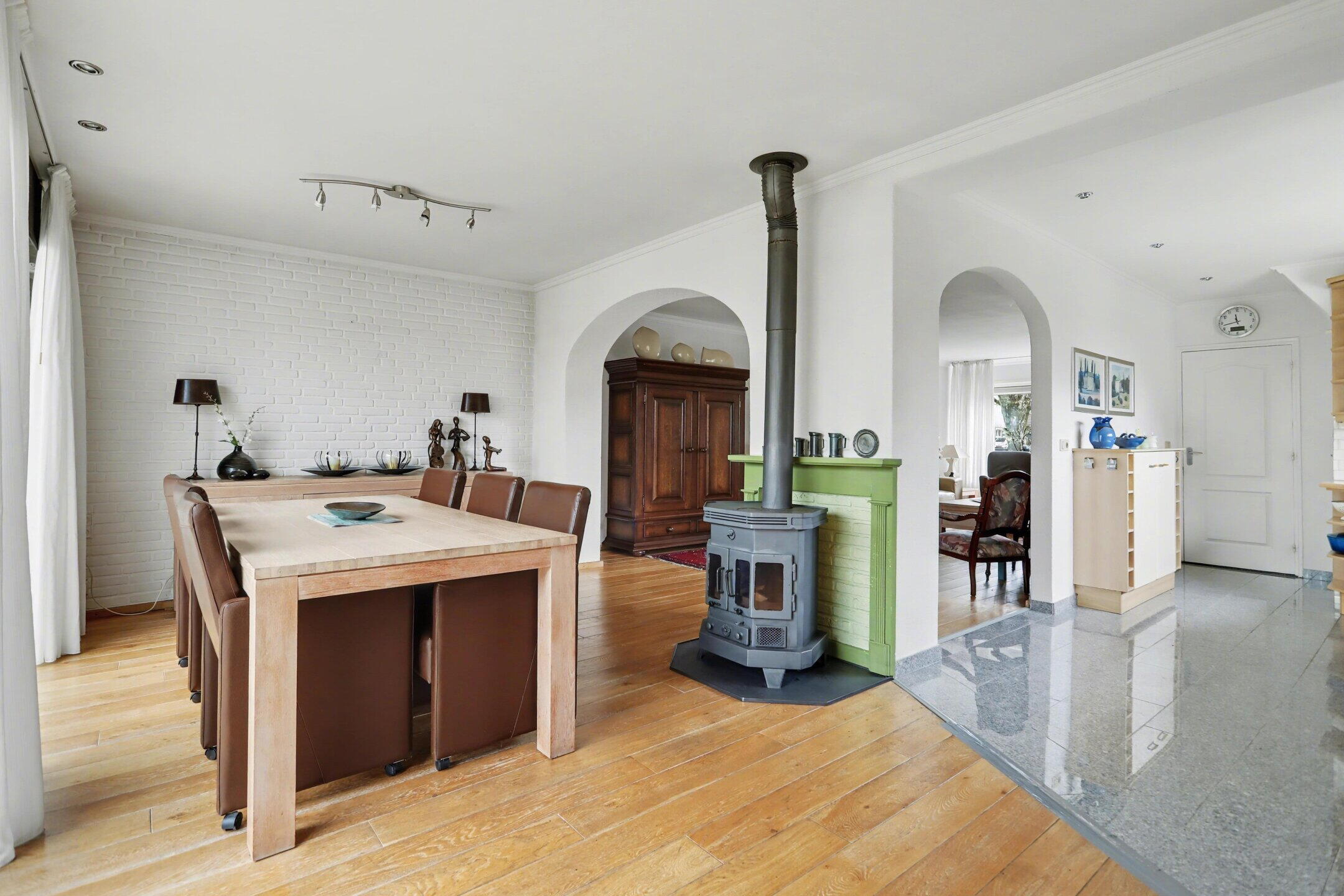 Entree/hal met toilet en fonteintje. Woonkamer met houten vloer en open haard. Open keuken met aansluitend de eetkamer en een aparte wasruimte.