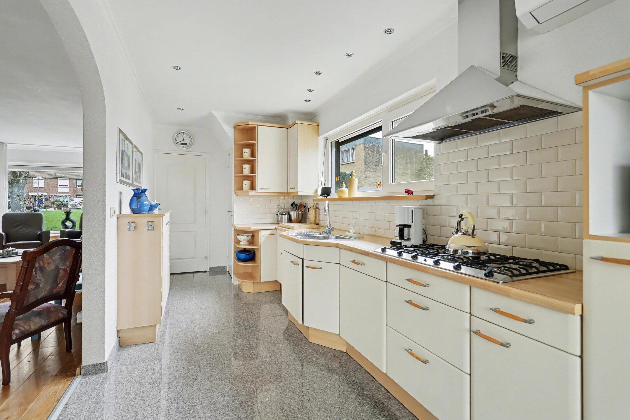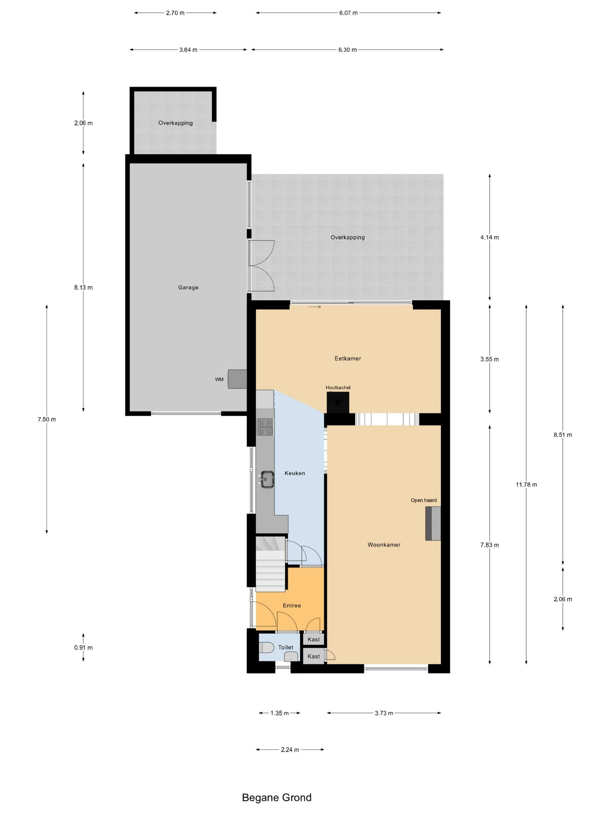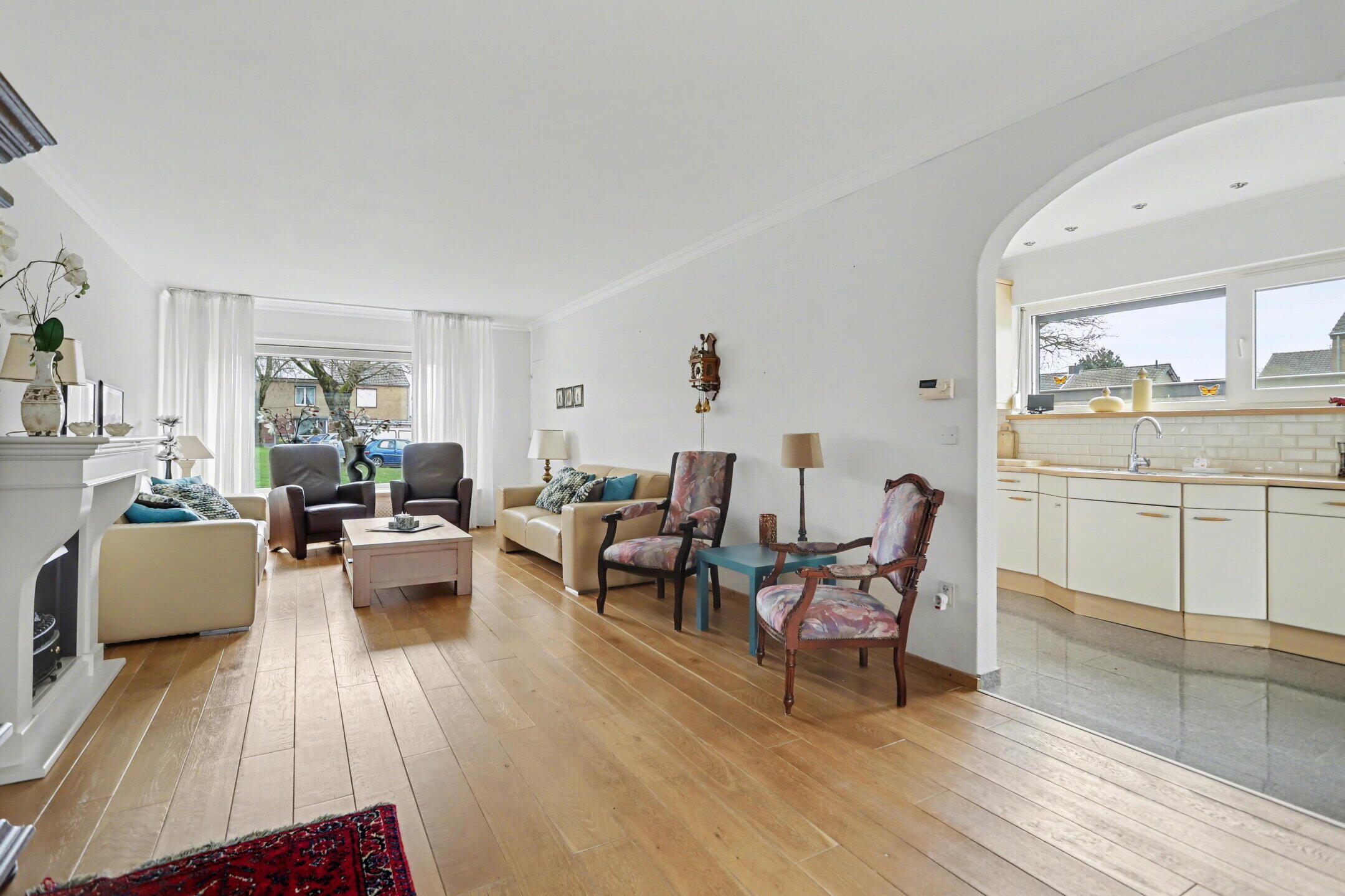 Entree/hal met toilet en fonteintje. Woonkamer met houten vloer en open haard. Open keuken met aansluitend de eetkamer en een aparte wasruimte.