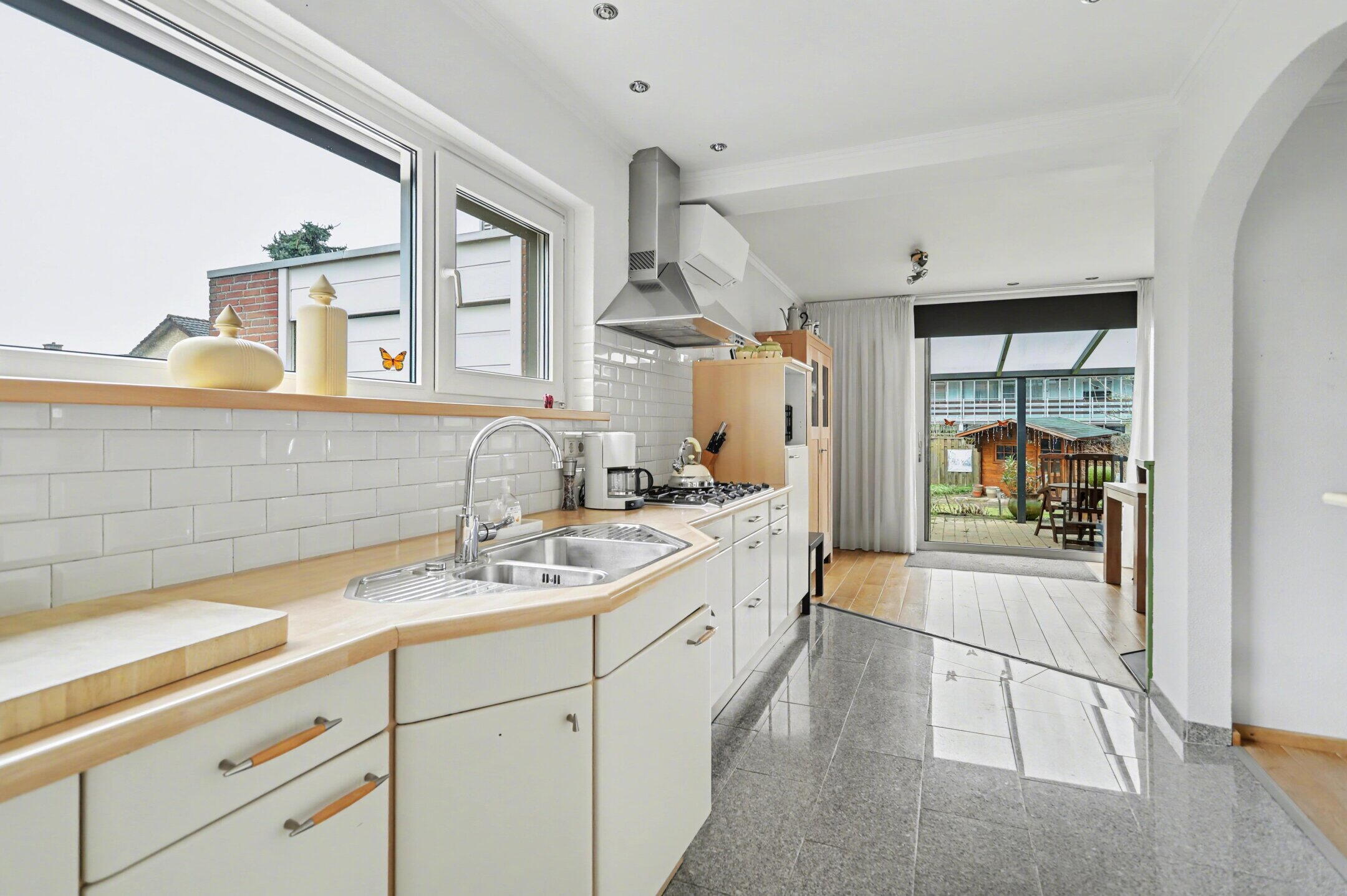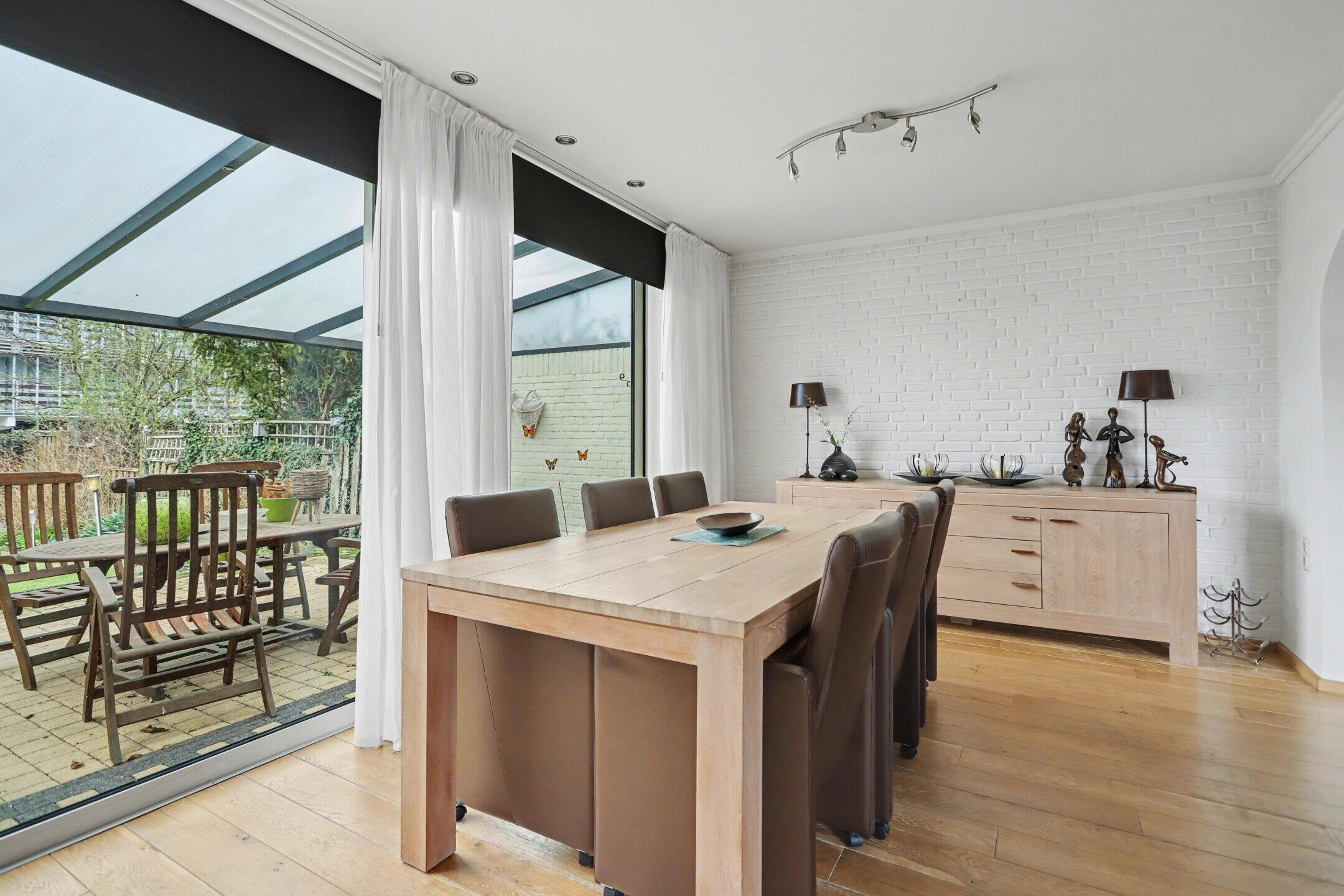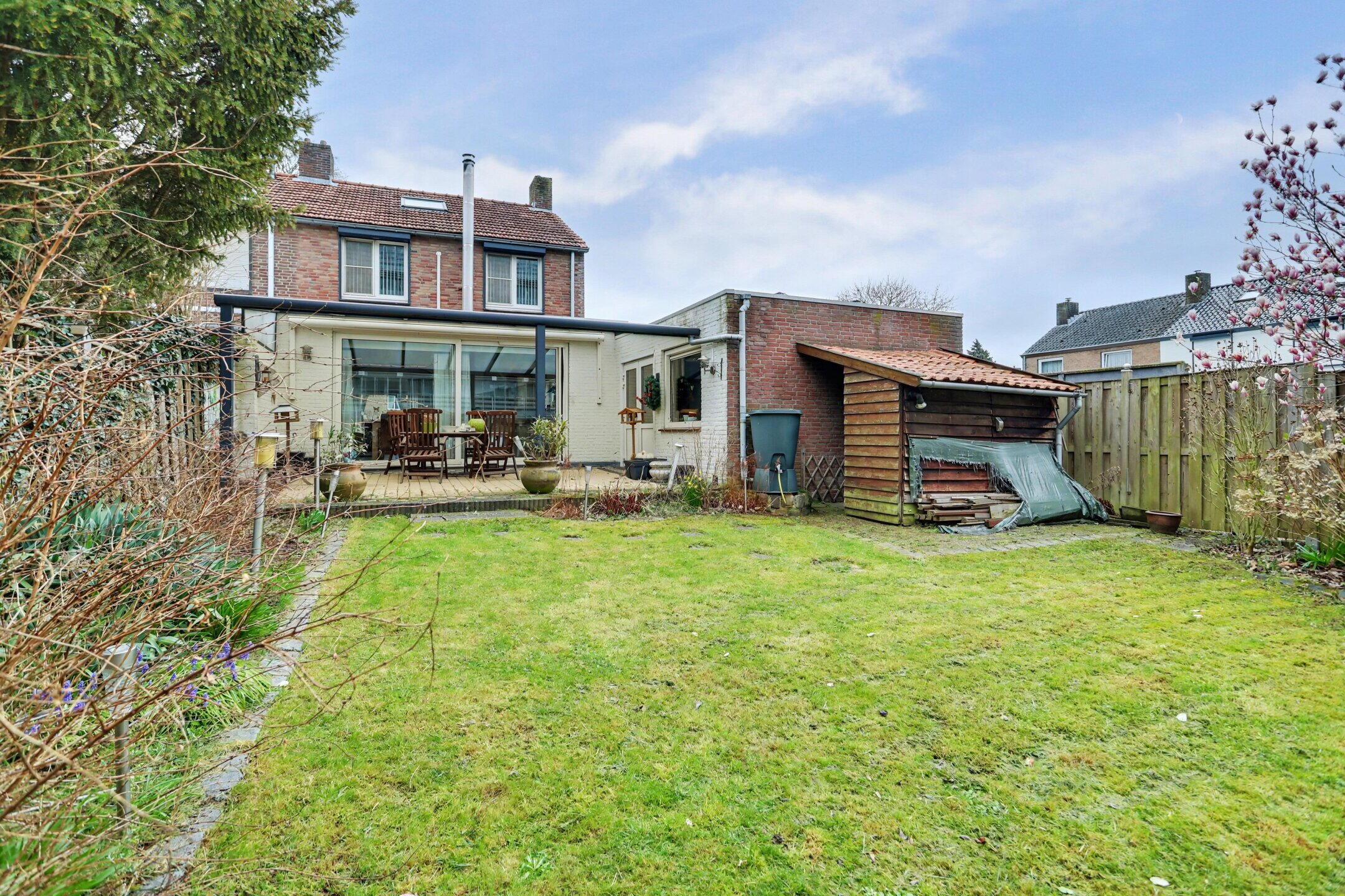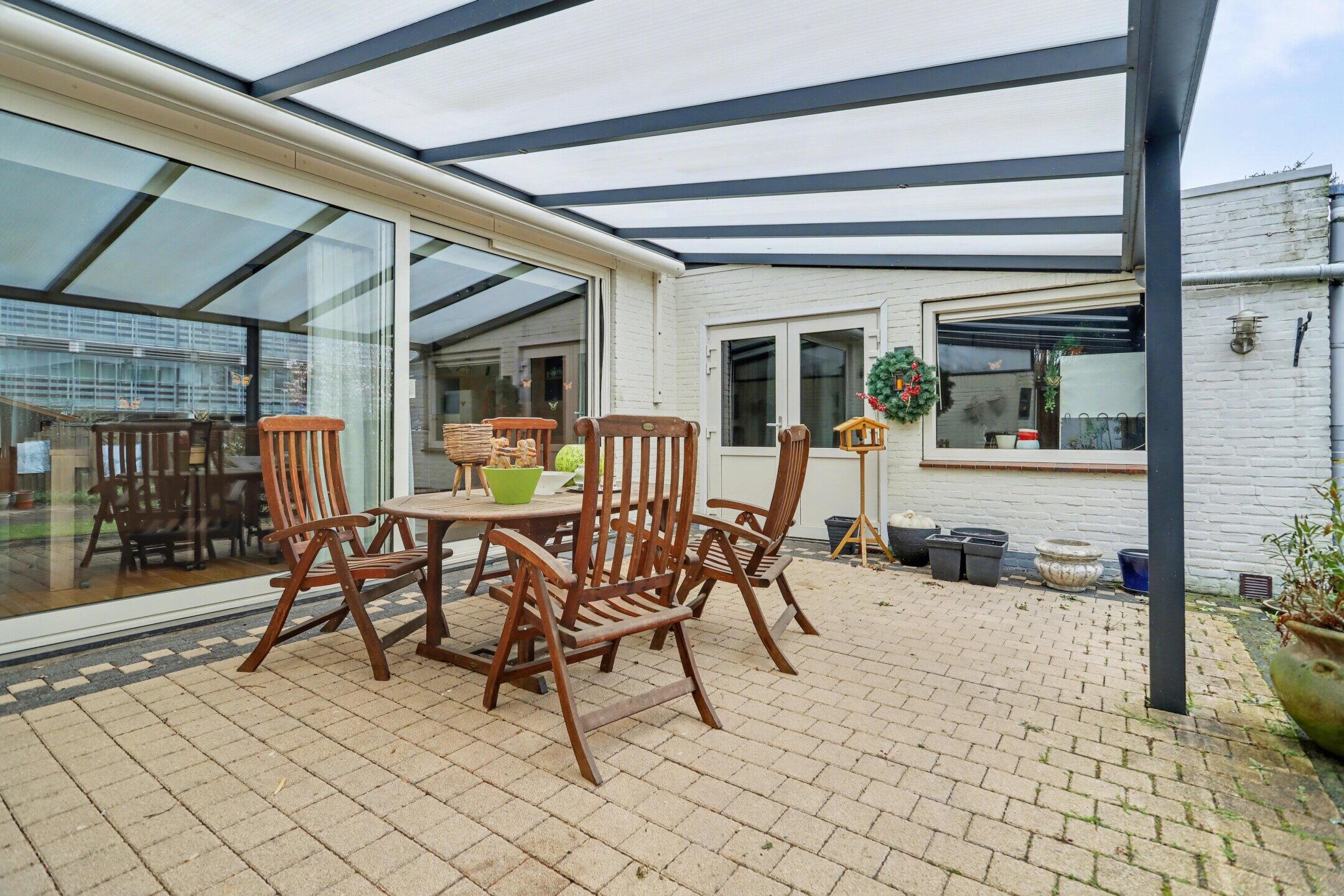Via de achterzijde bereikt u de overkappingen en de zonnige tuin op het westen. De garage biedt ruimte voor twee auto’s.
